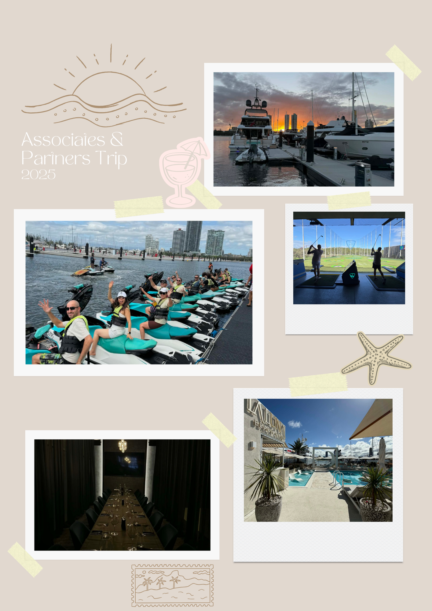 For the 2025 Associates & Partners trip, the dedicated team got to celebrate their reward in Gold Coast! To celebrate these achievements, the team did an array of activities like jet skiing, top golf, enjoying the beautiful scenery at the sky observation deck, played at the Glades Golf Course and enjoyed some pampering spa sessions. They also got together over some beautiful dinner at Blowfish, Bird Cage dining and had a lovely afternoon out at the La Luna Beach Club! The team rested in between all of these fun activities at the Sheraton Mirage Hotel in Gold Coast where the enjoyed the buffets and pools.